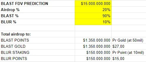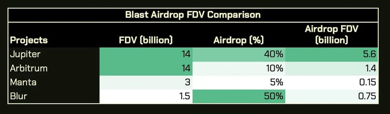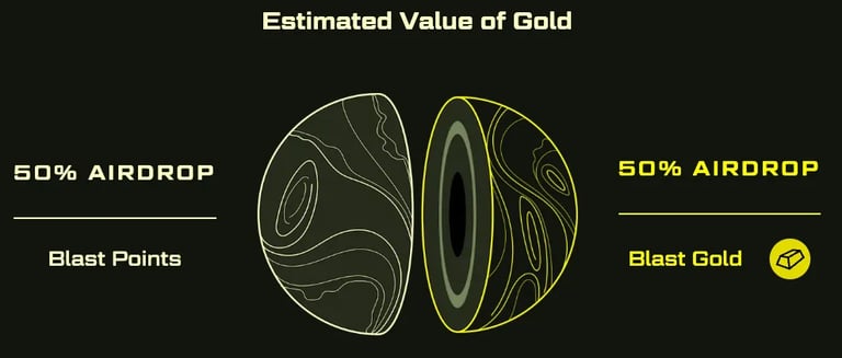 Blast TVL is currently standing at 1.51B with a peak of 2.3b. We know from the past that pacman loves handing out candy to his users with blur farmers getting 51% of the total amount of tokens issued throughout a total of 3 seasons. The way I am looking at this from a investors standpoint is that if we see a valuation of more then three to five times that of TVL, we can assume almost a near 100% roi (given you are also farming gold which I will talk a bit about later in the article). Assuming what we know about the tokenomics of Pacman in the past and by doing some simple maths, if users get back 20%, of a 10B fdv protocol that roughly equates to the peak TVL. Judging by some of Blast comps, including Jupiter (being similar in expectations), arbitrum and Manta. We know it is entirely possible for us to breach that double digit billy mark, if the market allows it. This ROI expectation is speculative, and is dependent on whether or not we see multiple seasons.
