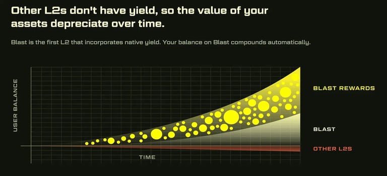 So let’s start with what is blast. Blast was designed as a competitor to other L2s such as Arbitrum and Optimism. If you’re reading this article, you’ve prob sent a Tx on Ethereum before and were prob shocked when you realized it costs $8 to send a $5 transaction, and took roughly an entire minute for it to confirm on the blockchain. So an L2 helps to solve this problem, by building a new chain on top of Ethereum that is faster, and cheaper for users. Fees are fractions of cent, and transactions are confirmed within seconds or less. All while having the security layer of Eth on top to protect the decentralization of the network. As L2s became more popular, Pacman asked the simple question of why aren’t users able to claim a native yield on top of their holdings. Ethereum offers a staking yield post POS. USD offers a yield through government treasuries. So why haven’t any of these L2s thought about the engineering problem of offering yield to its users. At the end of the day crypto land is a financialized world, and why wouldn’t users want to add an additional yield for doing what they were already doing. Pacman solved this problem with Blast. Not only does it offer yield, its L2 is very competitive with others in terms of their speed and costs. Costs often being a fraction of a cent, and speeds at less than one second to confirm. Blast is very user friendly. Not only this but the gas fees are then refunded back onto the contract owners, whom the user is interacting with. Providing revenues to protocols built on top of blast.