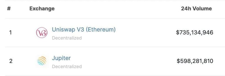 Jupiters major comps are uniswap, dydx, and makerdao. Jupiters volumes have already surpassed that of the largest DEX on ethereum uniswap. So we are potentially looking at quite the king maker.