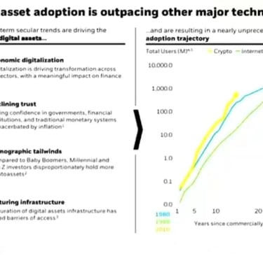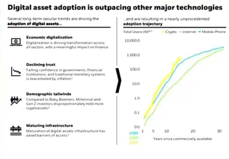 If you analyze the on-chain metrics (see below), you’ll notice increasing demand for alt coins across with significant and staggering increases in DAU (daily active users). Which is traditionally used as a metric to evaluate high growth start ups. Crypto is moving much more in lockstep with tech, which if you haven’t been paying attention has been the greatest performer of the past 20 years and where all of the American innovation has been coming from just take a look at the Qs vs all other ETFs and performant hedge funds. And then you have advocates from the largest asset manager in the world telling you that crypto adoption is moving quicker than the adoption of internet and mobile phones.